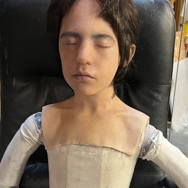 Realistic sIlicon dummy of a female pre-teen girl with real hair, facial hair, realistic skin tone, etc. No right arm. Approximately 140 cm long.